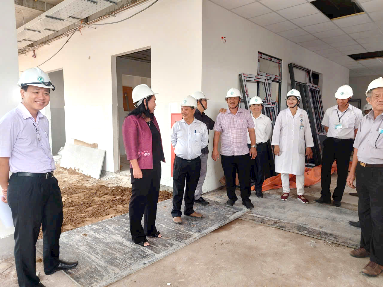 Ảnh: Bà Nguyễn Thị Bé Mười - Tỉnh ủy viên, Phó Chủ tịch UBND tỉnh giám sát công trình Bệnh viện Đa khoa khu vực Ba Tri